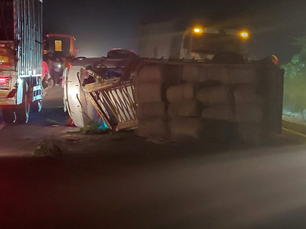 छिंदवाड़ा–सिवनी मुख्य मार्ग पर उमरिया इसरा और सिहोरा के बीच शनिवार रात एक बड़ा सड़क हादसा होते-होते टल गया। जानकारी के अनुसार एमपी-28-ZC-4582 नंबर की बरदानों से भरी पिकअप वाहन अचानक टायर फटने के कारण अनियंत्रित होकर बीच सड़क पर पलट गई।